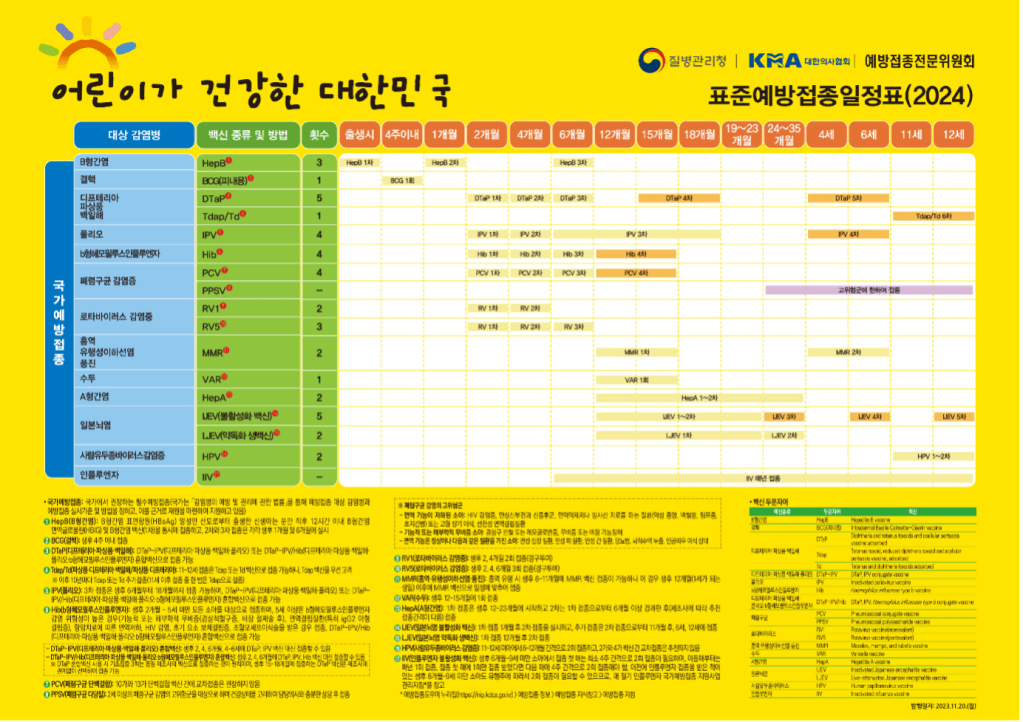 아래는 보건복지부가 권장하는 국내 영유아 예방접종 일정표입니다.