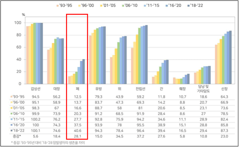 폐암은 췌장암, 간암과 함께 모든 암 중에서 발견이 어렵고 치료가 힘들어 3년 상대생존률이 가장 낮은 암종 중 하나로 꼽힙니다. 현재 폐암의 5년 상대생존율은 40.6%로, 여전히 낮은 수준입니다. 하지만 희망적인 소식도 있습니다. 1995년 폐암의 5년 상대생존율은 단 12.5%였으나, 이후 꾸준히 상승하여 모든 암 중에서도 생존율이 가장 크게 개선된 암으로 평가받고 있습니다.